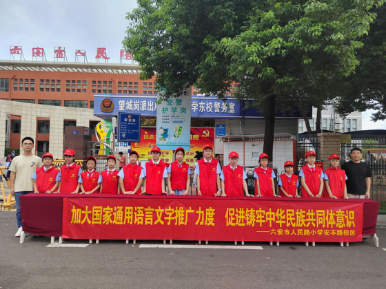金秋九月,丹桂飘香,在第28届全国推广普通话宣传周来临之际,为落实立德树人根本任务,营造学习使用国家通用语言文字的浓厚氛围,推动新时代语言文字事业高质量发展,人民路小学安丰路校区开展了以“加大国家通用语言文字推广力度,促进铸牢中华民族共同体意识”为主题的推广普通话系列活动。9月17日,随着清晨的第一缕阳光洒满校园,学生志愿者搭起宣传台,发放宣传单,向同学和家长介绍推广普通话的重要意义。学校通过电子屏播放宣传海报和宣传视频,向师生和家长进行推广普通话宣传。一字一句都是中华的声音,一笔一画皆是华夏的容颜。
