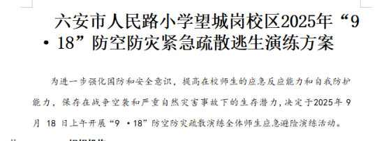 9月18日上午,为铭记历史,强化师生国防观念与防空防灾应急能力,六安市皖西路小学组织全校师生开展 “9・18” 防空应急疏散演练活动,以实际行动传承爱国精神。演练前,学校总务处结合校园实际制定详细预案,明确各岗位职责、疏散路线与动作规范。通过主题班会、校园广播等形式,向师生普及 “9・18” 历史背景、防空警报信号分类及应急避险技巧,确保每位参与者熟悉流程、掌握要领。上午 9 时 18 分,随着第一声防空预先警报信号响起,演练正式启动。各班班主任迅速组织学生双手抱头、弯腰弓背,就近躲避于课桌下方、墙角等